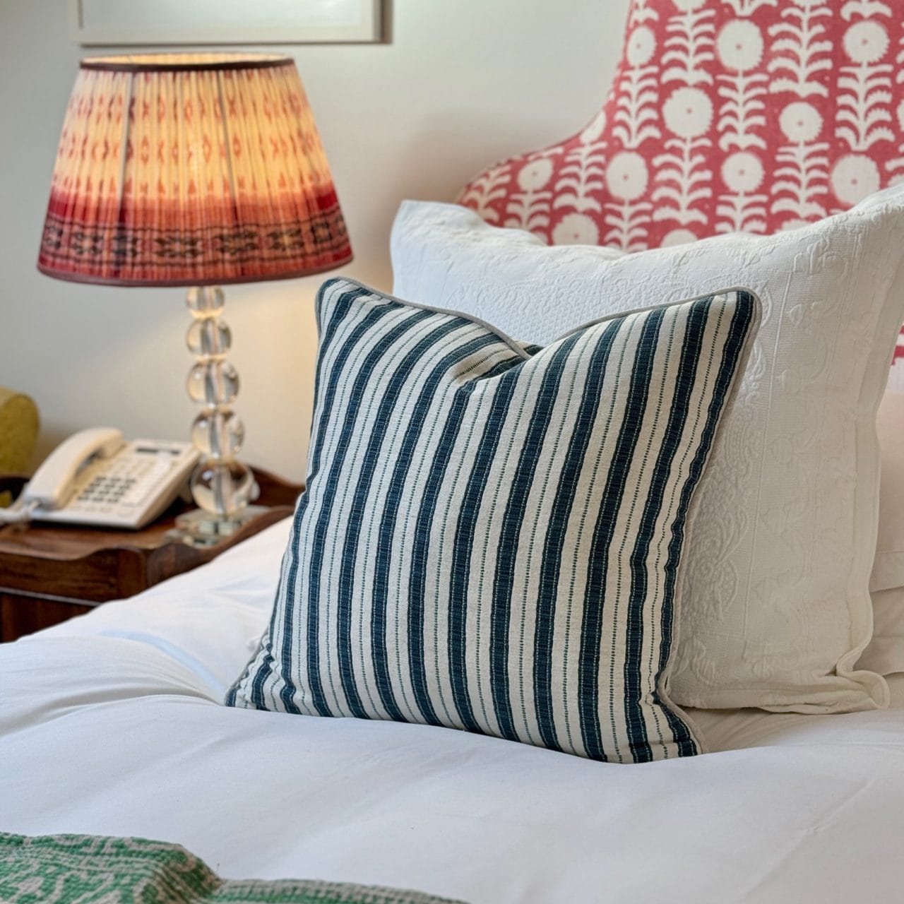 Our Robert Kime Tynemouth Ticking Blue cushion feels especially fitting today, with its beautiful red stripes adding a gentle nod to the season.
