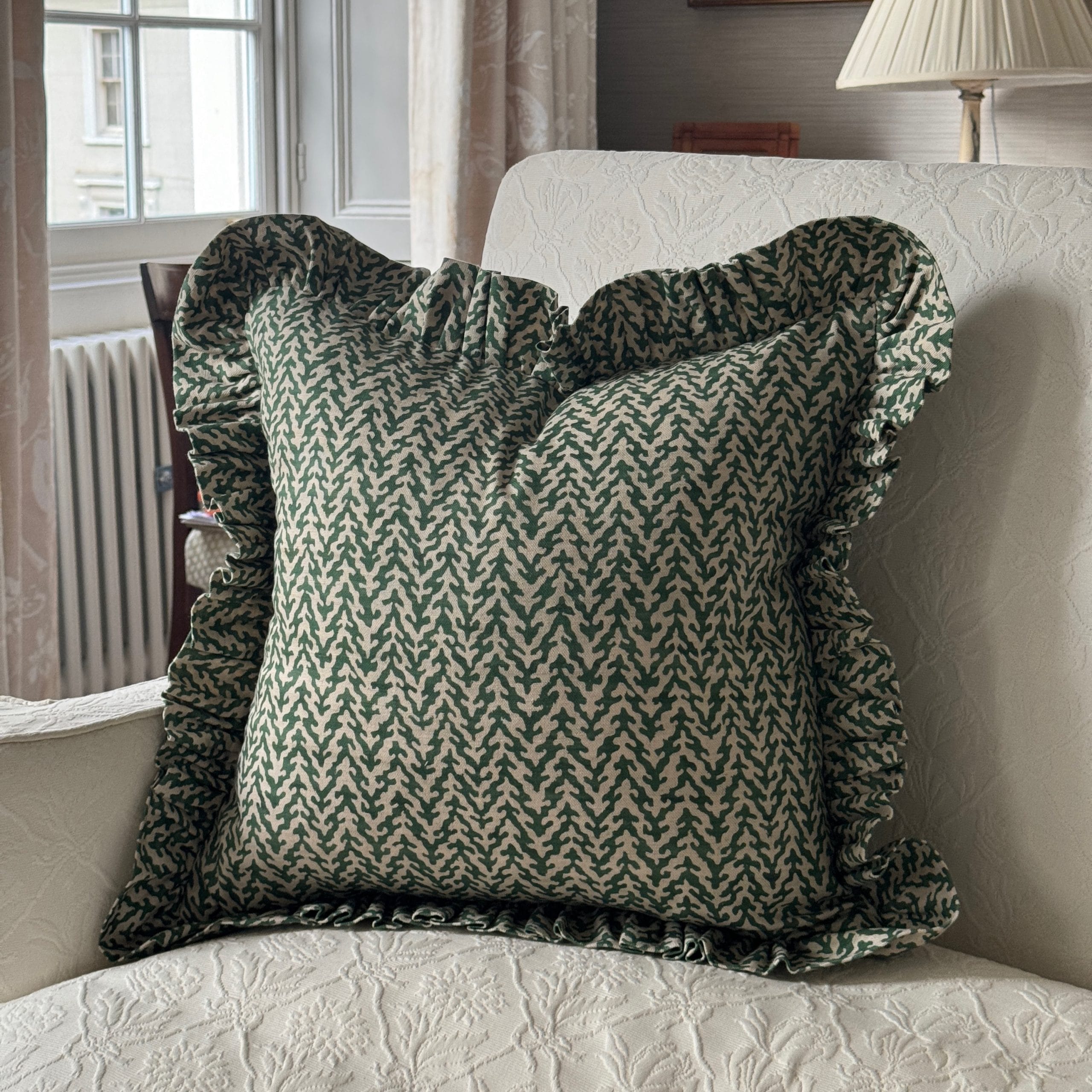 This design was popular during the Mamluk Dynasty’s rule over Egypt and the Levant (1250–1517). The linked chevron, block-resist printed pattern was made in India specifically for export to Egypt. Centuries later, this ancient design still looks fresh and contemporary. Printed on the finest linen, and finished with a pretty frill. Our cushion covers are handmade in England.