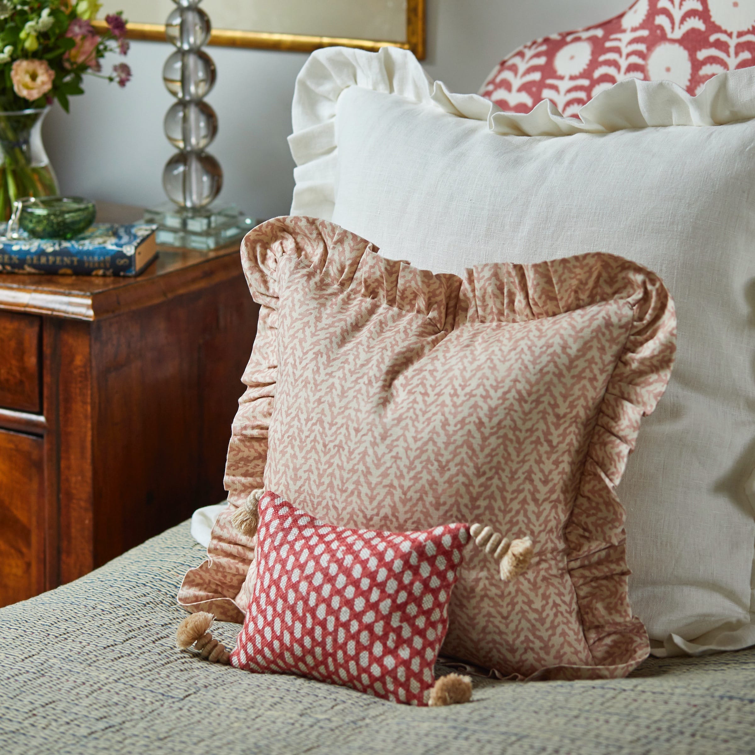 This design was popular during the Mamluk Dynasty’s rule over Egypt and the Levant (1250–1517). The linked chevron, block-resist printed pattern was made in India specifically for export to Egypt. Centuries later, this ancient design still looks fresh and contemporary. Printed on the finest linen, and finished with a pretty frill. Our cushion covers are handmade in England.