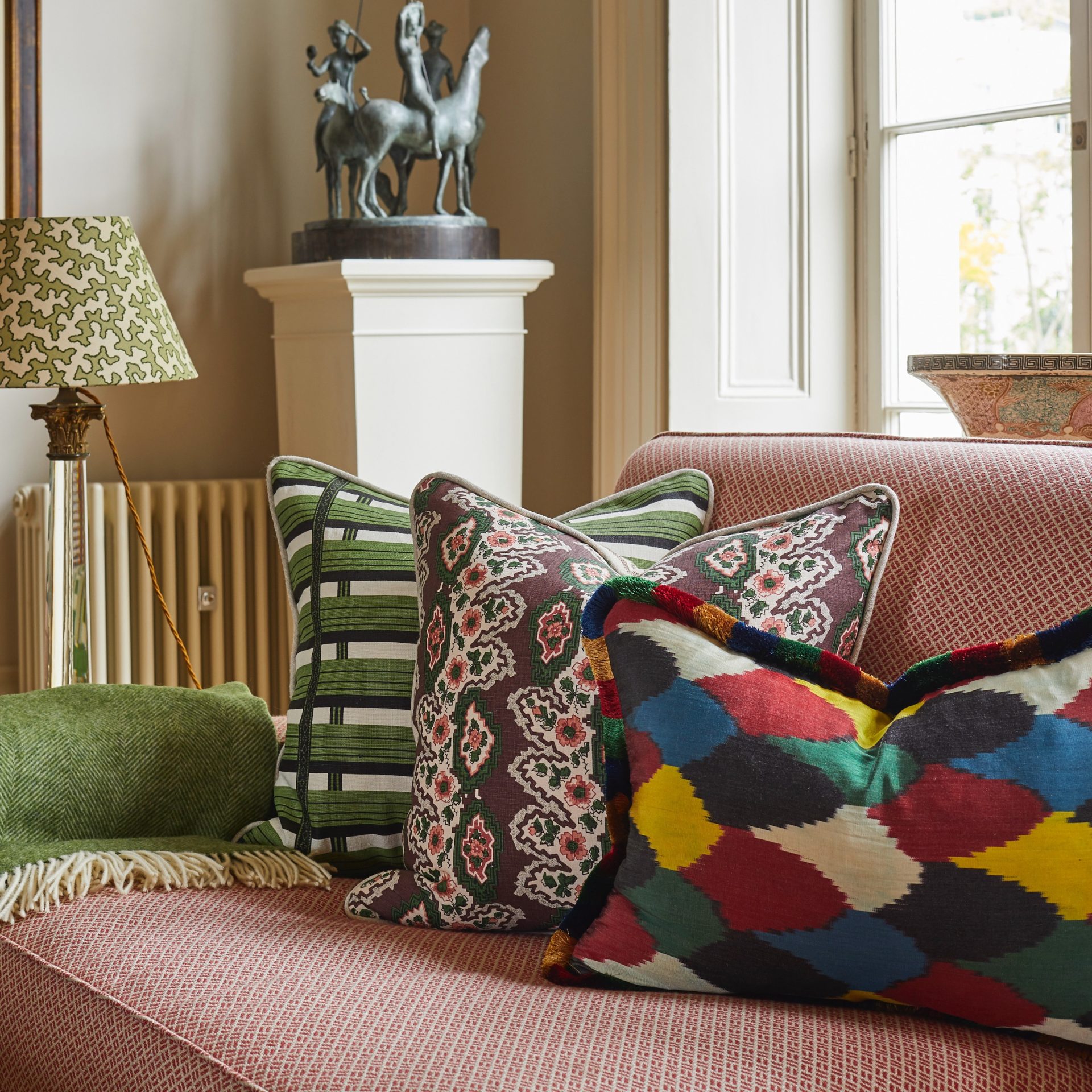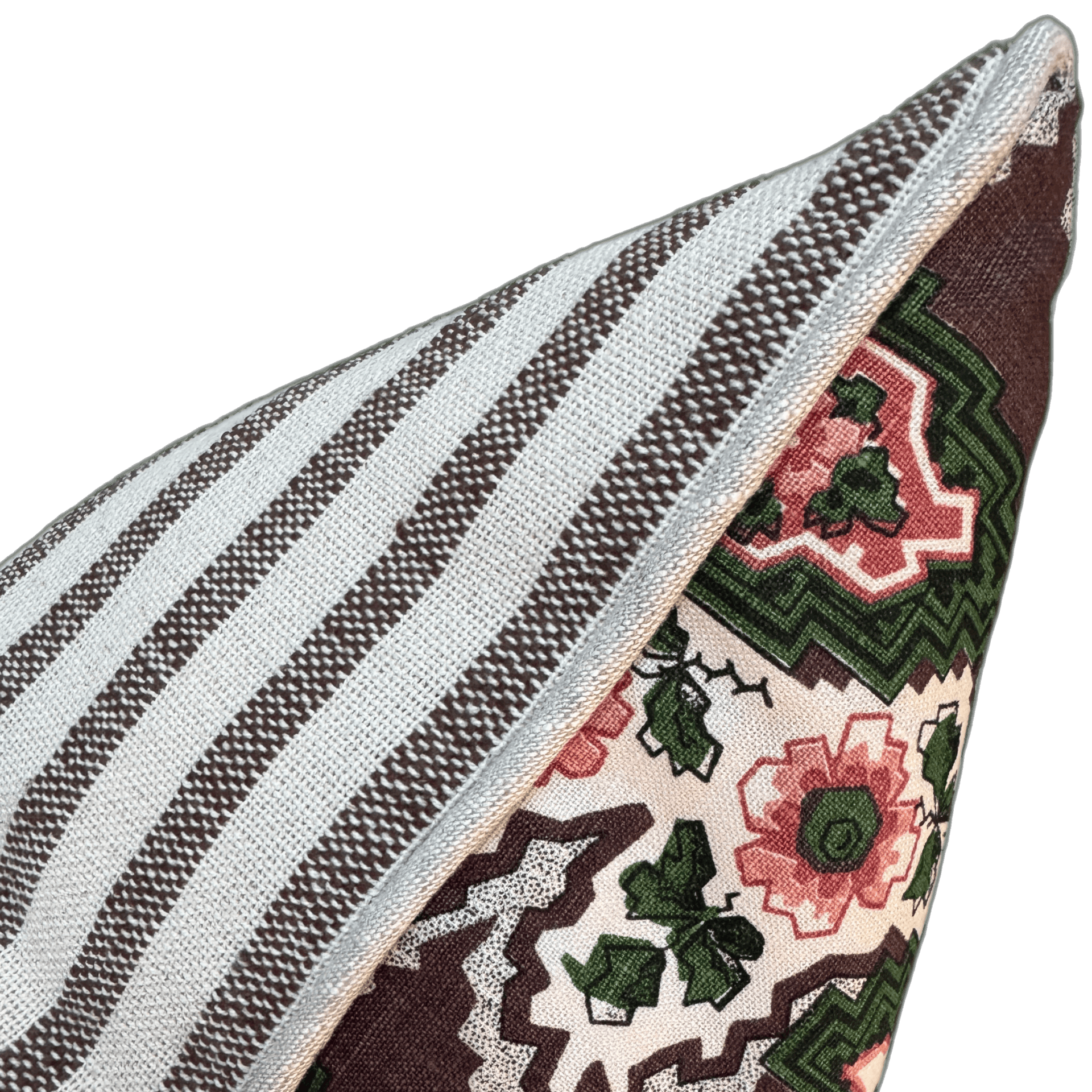 This bold floral stripe design is a new timeless classic by Sarah Vanrenen. We have paired it with Guy Goodfellow’s iconic olive sacking and finished with a 100% linen piping. Our cushion covers are handmade in England.