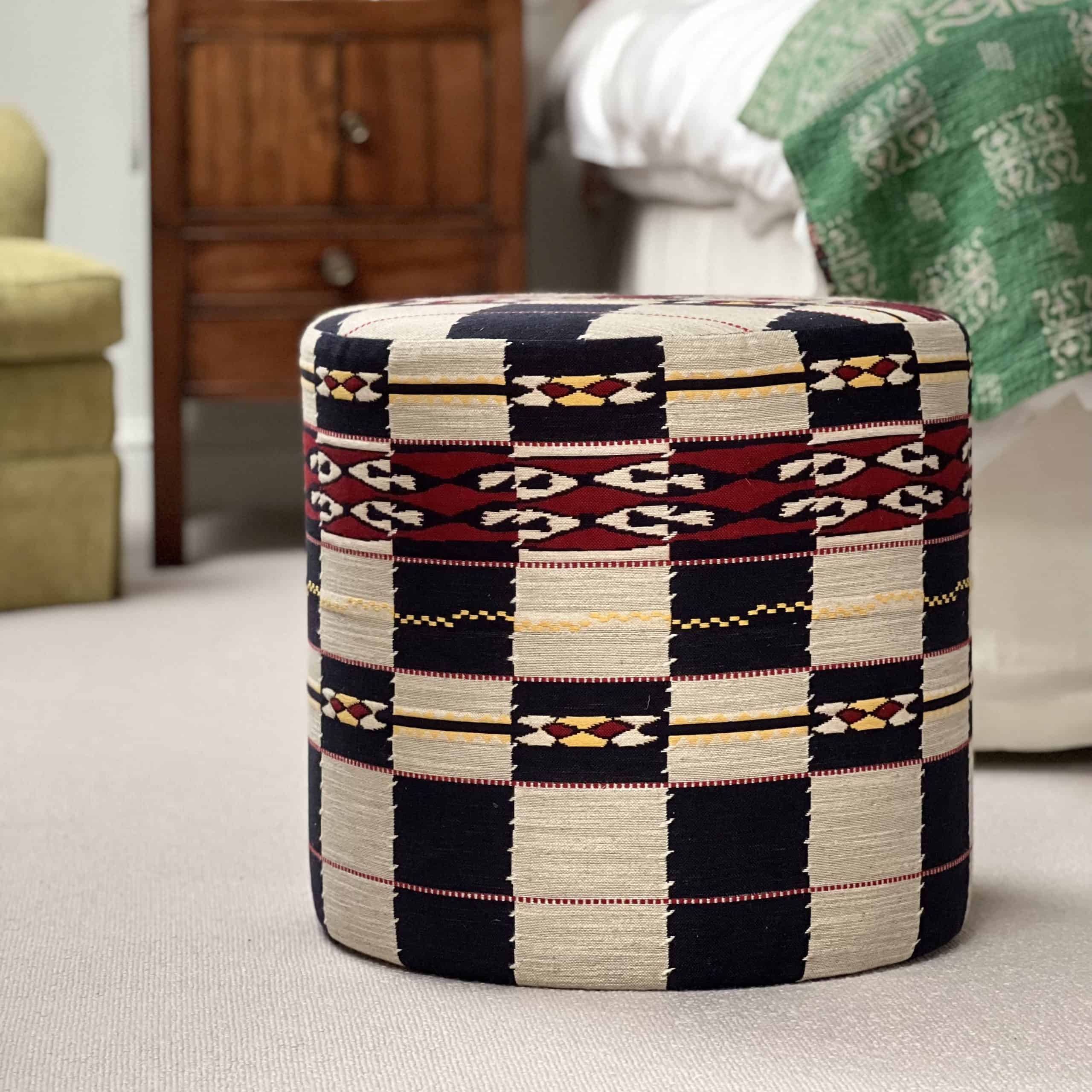 Fun and vibrant checked weave, with a nod to aztec. Available here in indigo, with details of red and yellow. Our Pouffes our handmade in England.