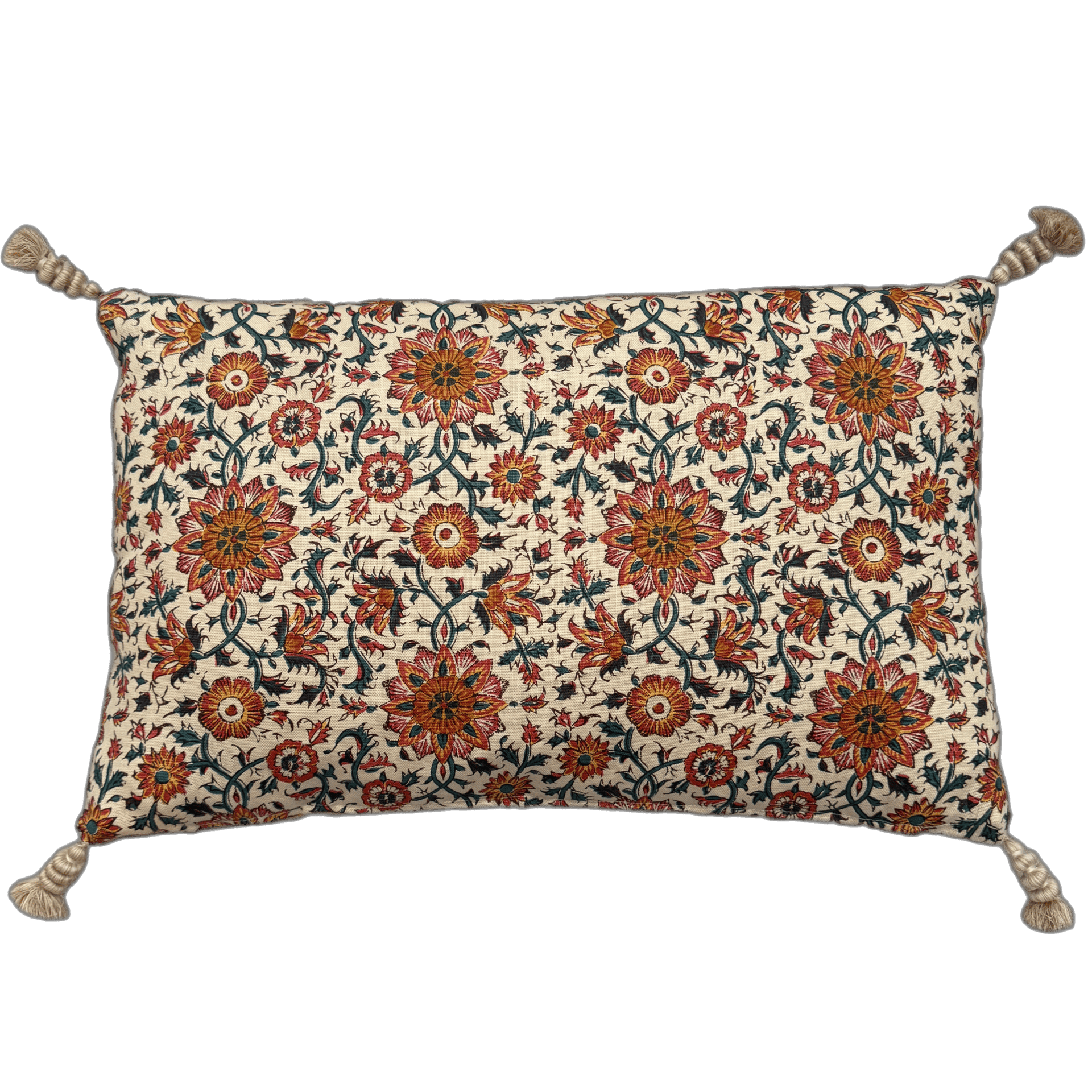 A joyful ode to mid-century charm, this fabric pairs a traditional Persian floral motif with a gentle rhythm of colour. It reminds us of the patterned textiles that once lined the sitting rooms of the 1960s — familiar, comforting and quietly elegant. We’ve reimagined it for today with a contrasting linen reverse in a soft yellow, adding depth and a subtle modern edge finished with a tassel. Each cushion cover is handmade in England.