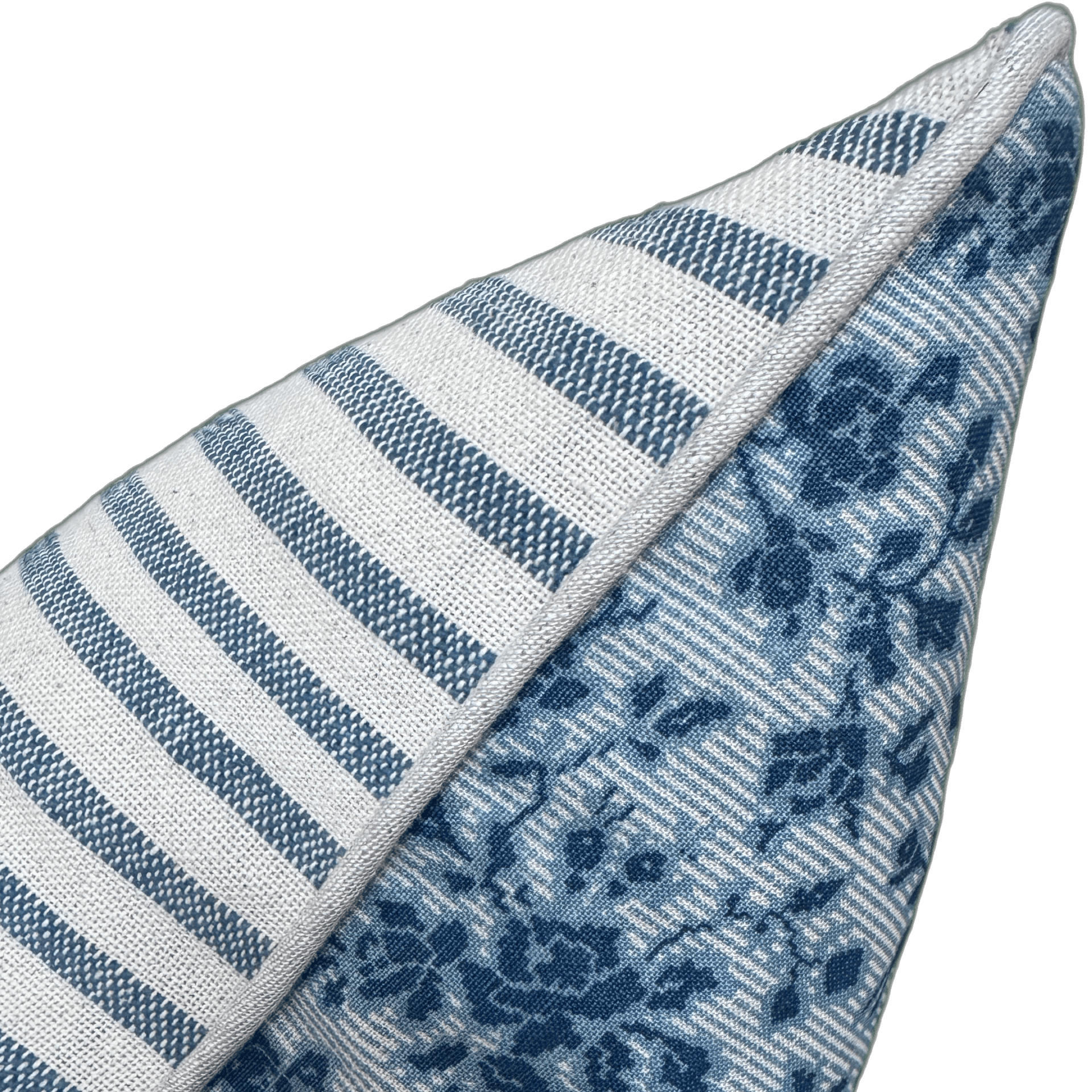 This floral design with a subtle striped linen ground cloth, is a new timeless classic by Sarah Vanrenen. We have paired it with Guy Goodfellow’s iconic olive sacking and finished with a 100% linen piping. Our cushion covers are handmade in England.